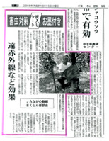 森林劣化を防ぐ為 間伐、下草の手入れ、灌木の保護等の整備作業を推進させよう。 樹木の活性化の為 現在、樹木再生化事業に取り組んでいます。 みなさん、道路を歩くと街路樹が、害虫アメリカシロヒトリの影響で枝がきり落とされ 、ところによってはゴーストタウンの様相になっています。 この原因である害虫アメリカシロヒトリは、樹勢が強いと寄り付かないという結果が発表されています。 (下記の日本農業新聞の記事参照) そこで害虫に蝕まれた街路樹を再生化し、樹木本来の役割を果たすようにすれば、町並みの景観もよくなり、かつ地球温暖化に少しでも貢献できるものと考え ます。 発表によりますと、樹勢を強めるには、「グリンプロシート(マイナスイオンと遠赤外線で樹木に勢いをつける)」による方法です。 この方法で効果が実証されております。 みなさまのご協力をお願いいたします。